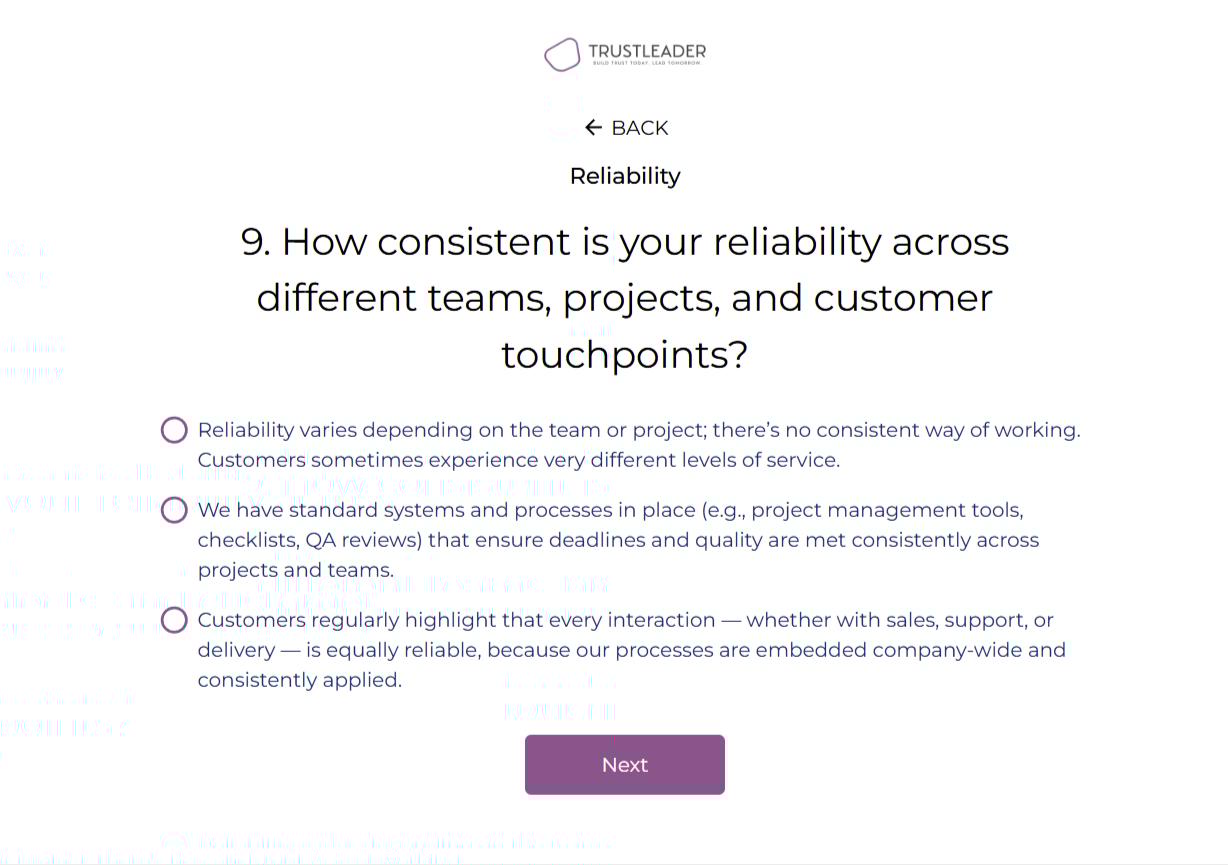 Answer 45 questions to exactly pinpoint where trust breaks down in your buyer journey — and how to fix it. Instantly get detailed next steps for each of the nine trust-building dimensions that matter.
